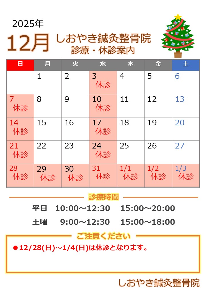 年末年始(12/28~1/4)は休診となりますのでご注意ください。