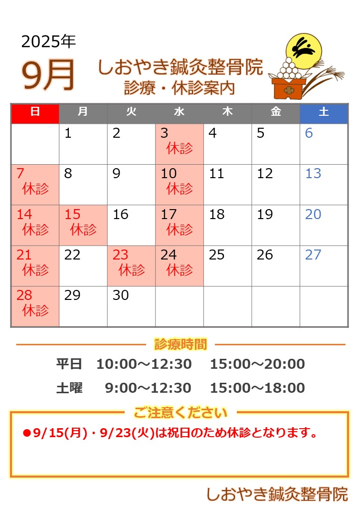お知らせ 9月の営業日のお知らせ 2025年8月28日 2025年8月28日 しおやき鍼灸整骨院スタッフ 9月の休診日 9/3(水)9/7(日)9/10(水)9/14(日)9/15(月)9/17(水)9/21(日)9/23(火)9/24(水)9/28(日) 9月の営業日の注意点 9/15(月)・9/23(火)は祝日のため休診となります。