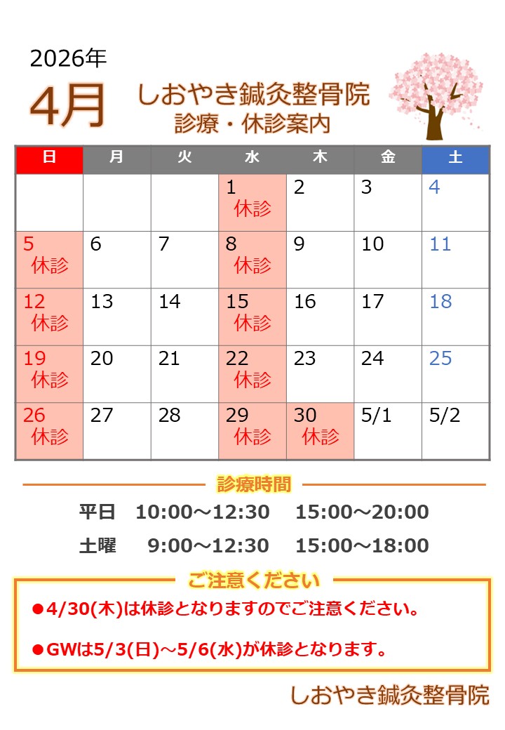 4/30(木)は休診となりますのでご注意ください。