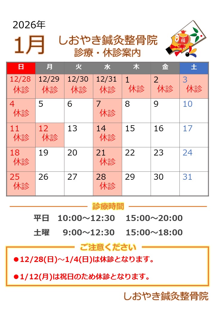 ・1/12(月)は祝日のため休診となります。