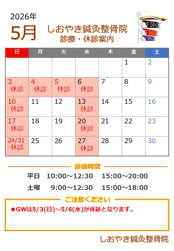 お知らせ 5月の営業日のお知らせ 2026年4月29日 2026年4月29日 しおやき鍼灸整骨院スタッフ 5月の休診日 5/3(日)5/4(月)5/5(火)5/6(水)5/10(日)5/13(水)5/17(日)5/20(水)5/24(日)5/27(水)5/31(日) 5月の営業日の注意点 GWは5/3(日)~5/6(水)が休診となります。