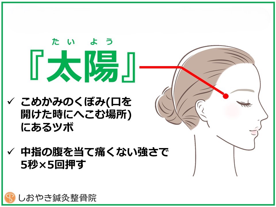 - 押し方:両手の中指で円を描くようにやさしくマッサージ
